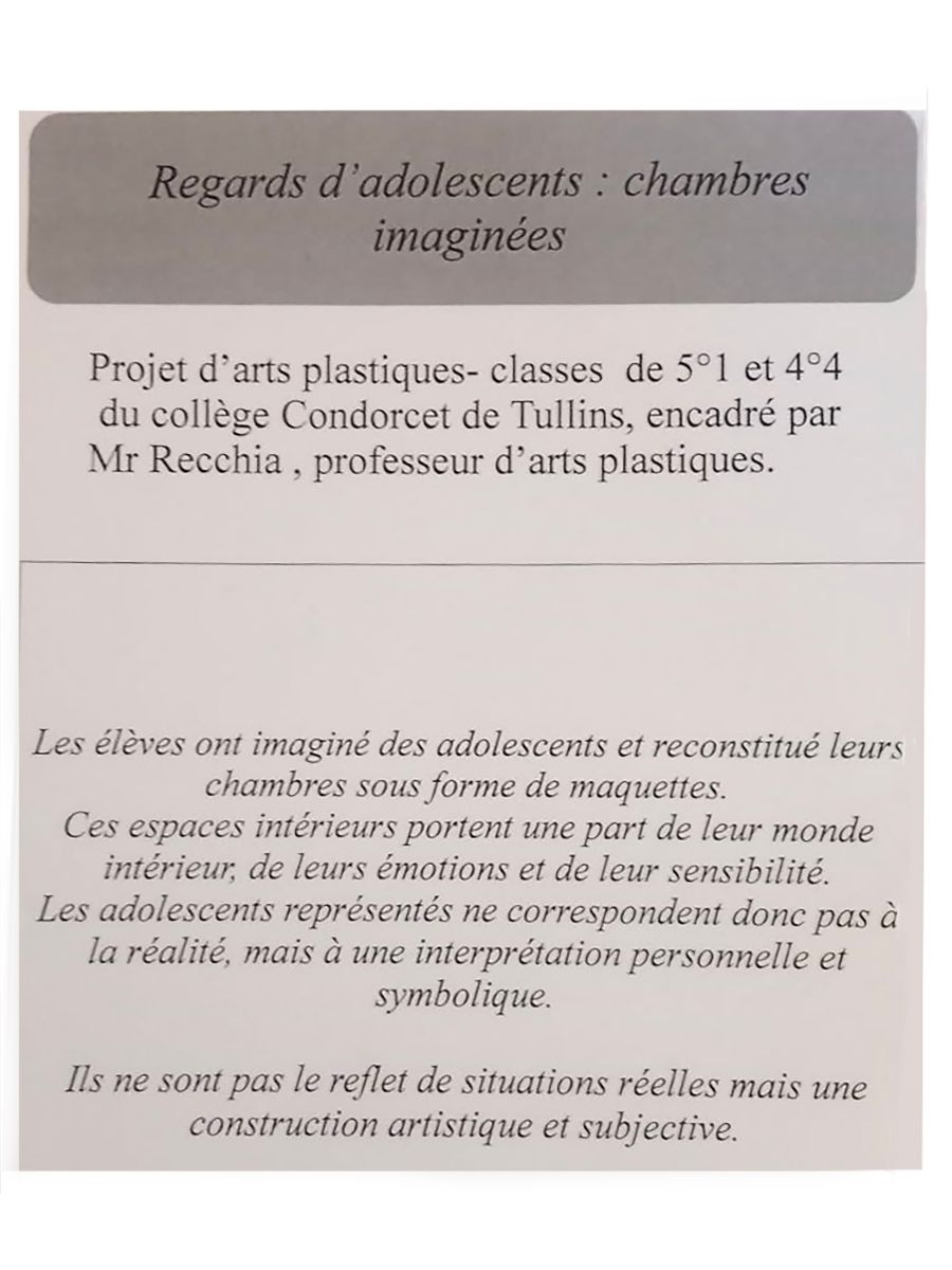 L’exposition nous balade ainsi des chambres rurales du Gers aux urbaines d’Argenteuil, de celles des villages de l’Hérault aux chambres blanches et meublées de l’aide sociale à l’enfance. Elle nous fait découvrir le parcours, les idées, pensées, émotions et engagements de 20 jeunes personnes contemporaines, âgées de 12 à 19 ans.