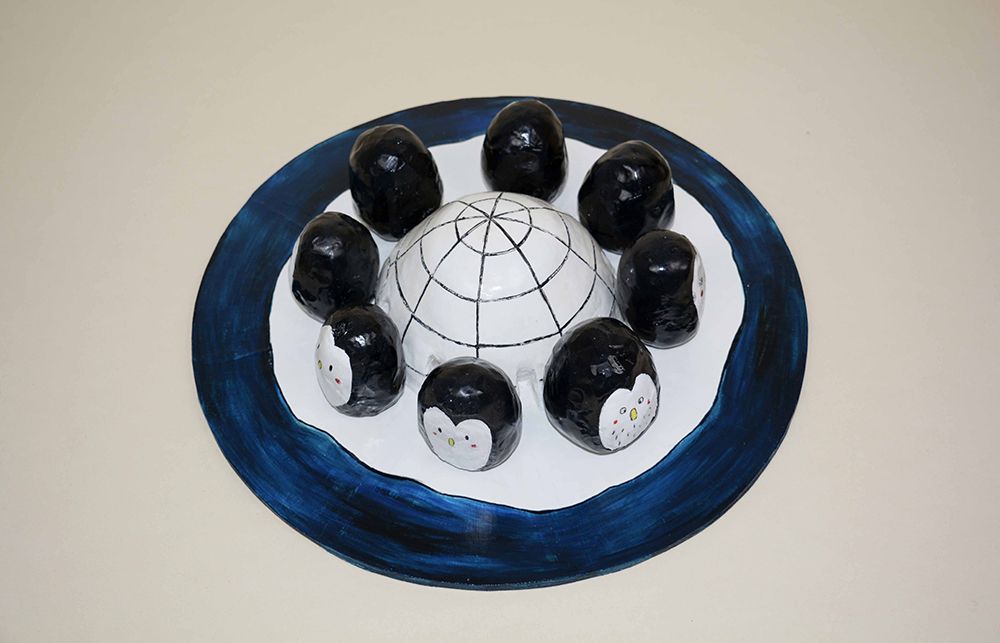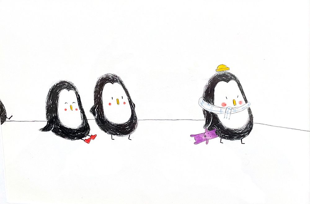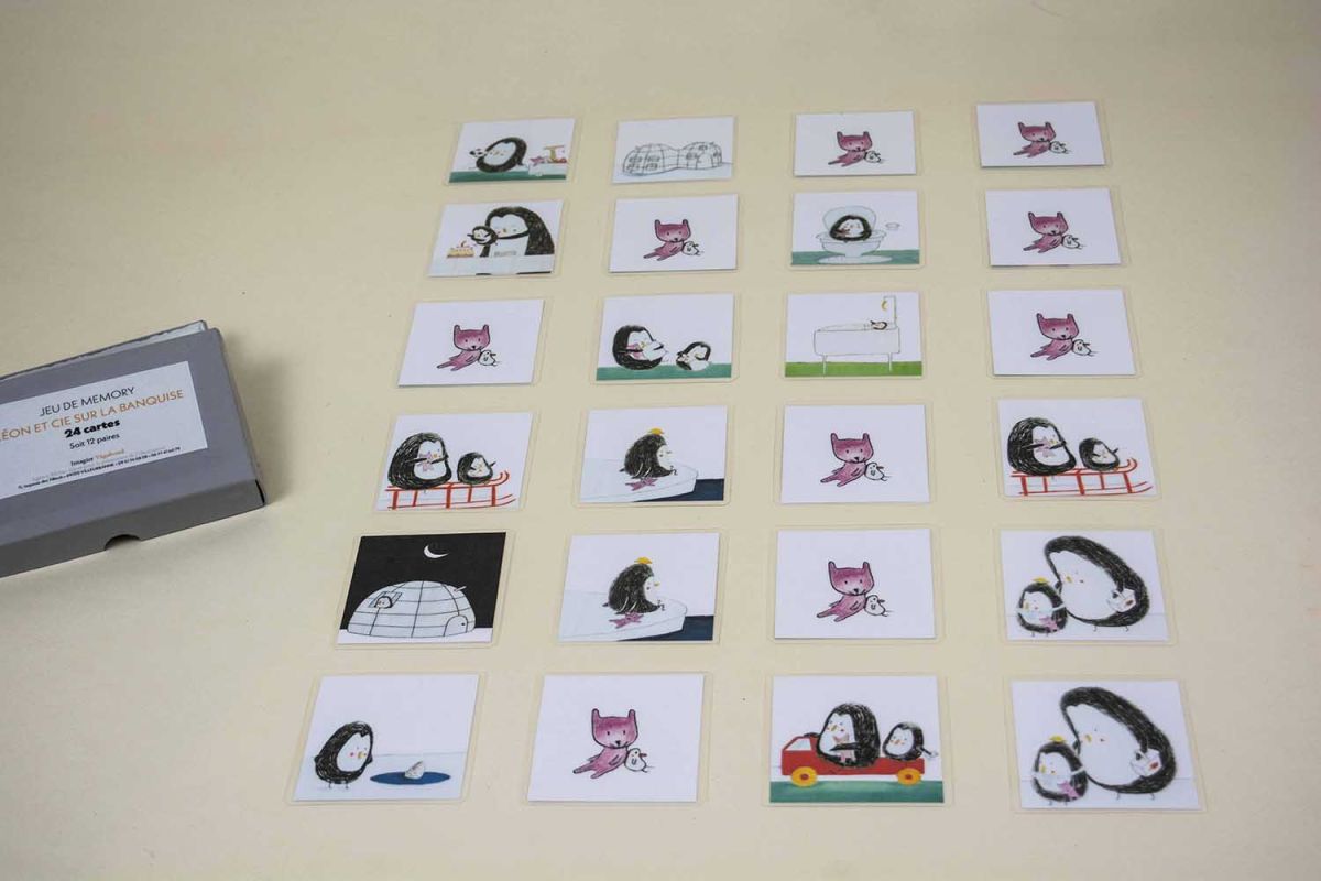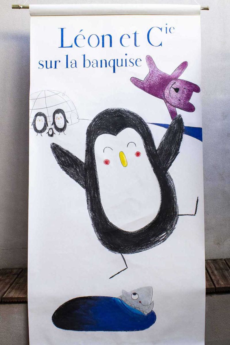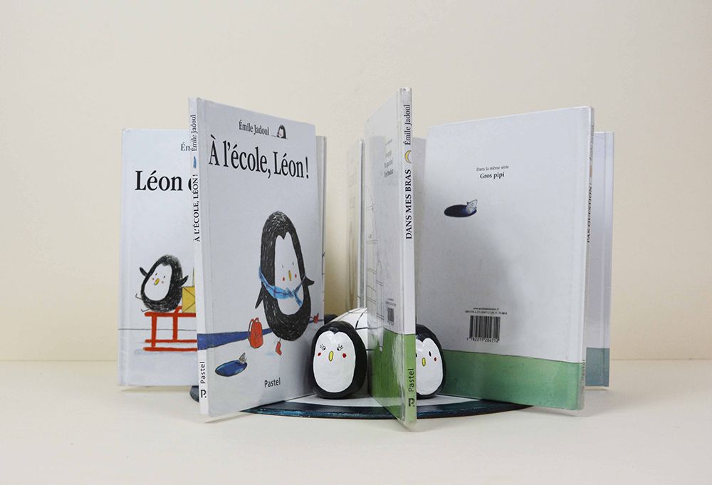 À l'école, Léon ! : 4 illustrations originales double page d'Émile JADOUL. Technique : crayon Luminescence de couleur et noir. Illustrations mises en valeur dans 4 cadres avec passe-partout blanc, verre et baguette de couleur.