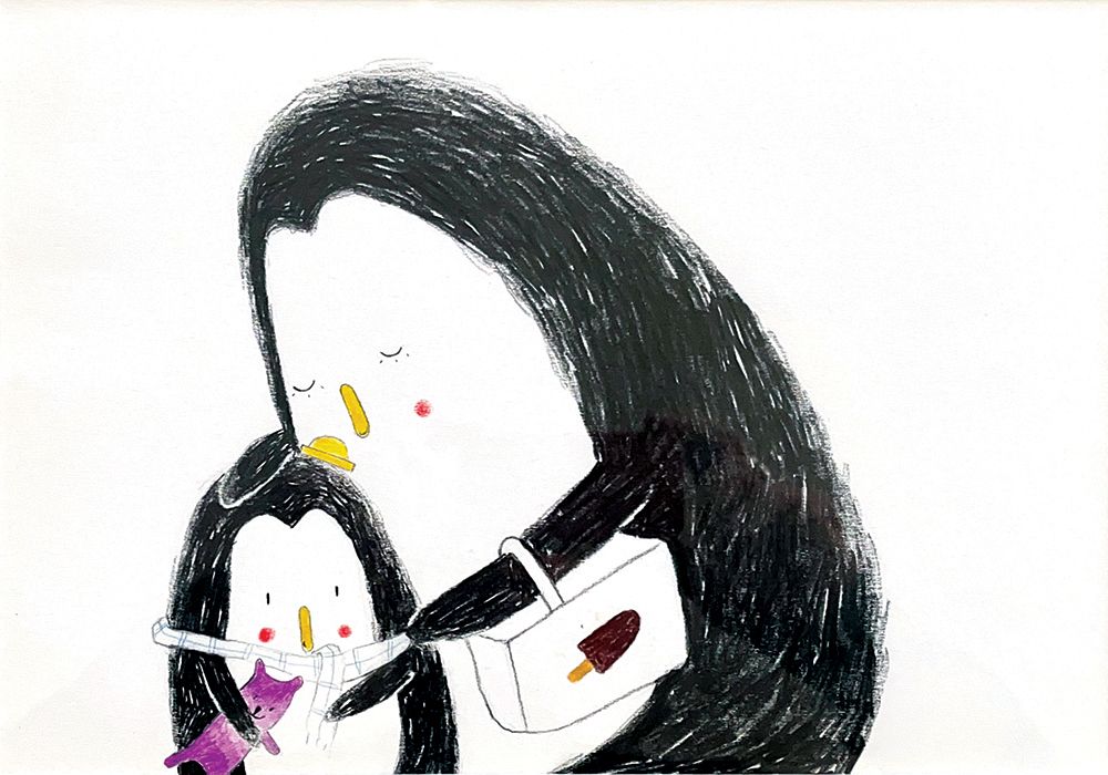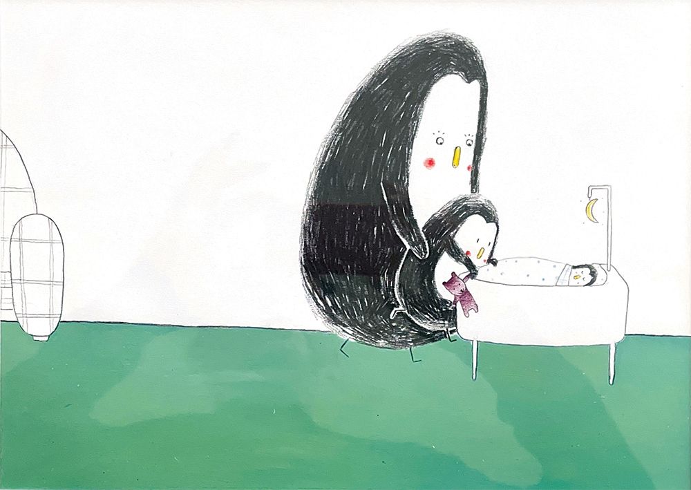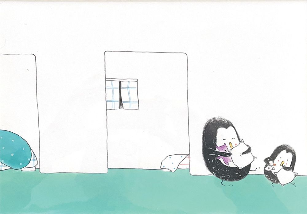 Dans mes bras : 4 illustrations originales double page d'Émile JADOUL. Technique : crayon Luminescence de couleur et noir. Illustrations mises en valeur dans 4 cadres avec passe-partout blanc, verre et baguette de couleur.