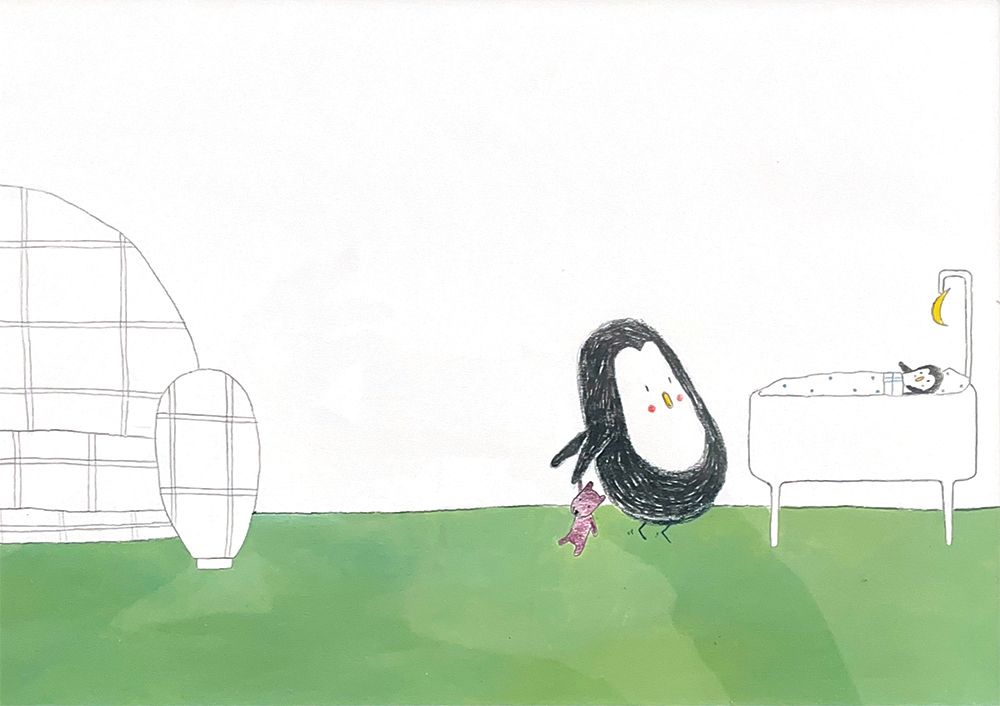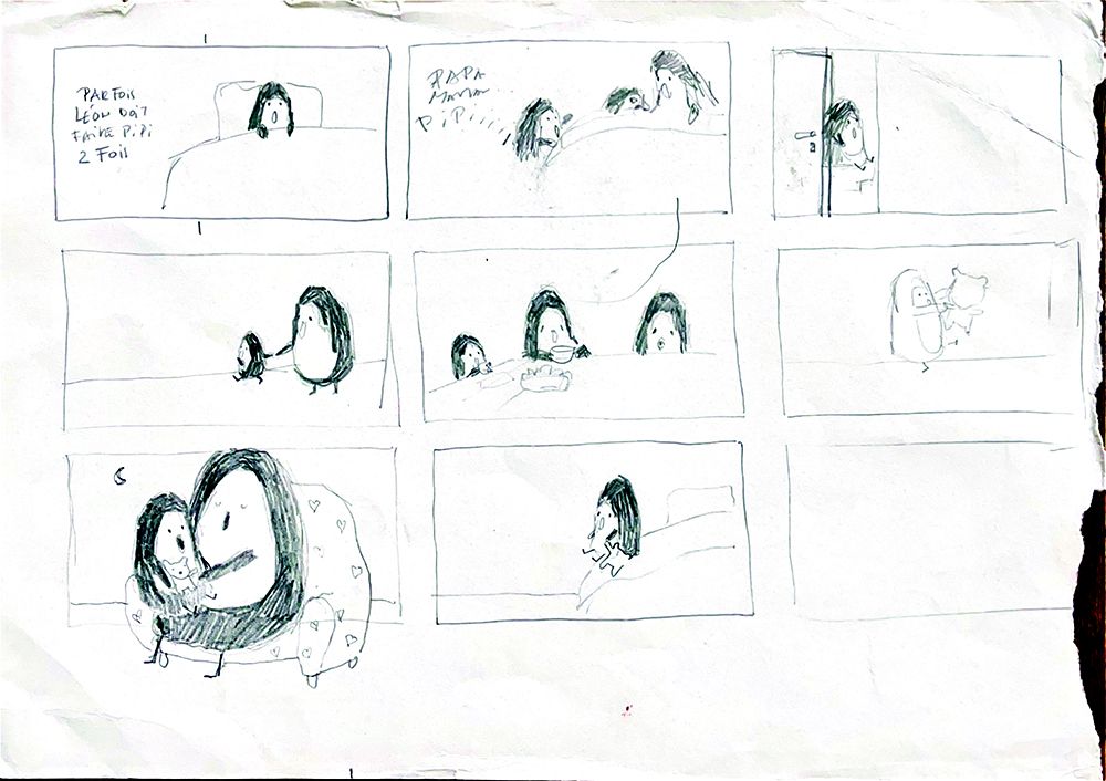 Le grand lit de Léon : 4 illustrations originales double page d'Émile JADOUL. Technique : crayon Luminescence de couleur et noir. Illustrations mises en valeur dans 4 cadres avec passe-partout blanc, verre et baguette en bois naturel.